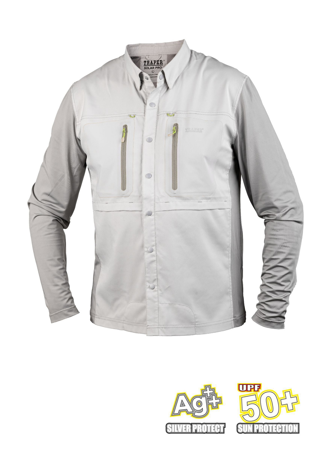 Koszule z serii Solar Pro cechują najwyższej jakości materiały oraz perfekcja wykonania. Koszule składają się z dwóch różnych tkanin. Na rękawach i bokach koszuli zastosowano bardzo miękki i rozciągliwy poliester ze spandexem. Ma on za zadanie odprowadzanie potu jednocześnie dokładnie dopasowując się do sylwetki. Korpus koszuli uszyty jest z poliestru klasy UPF 50. Jest to bardzo skuteczna bariera przeciwsłoneczna. Kołnierzyk przypinany jest na zatrzaski. Umożliwia to szybkie podniesienie aby chronić szyję w razie silnego nasłonecznienia. Na piersiach znajdują się dwie bezszwowe, elastyczne kieszenie zamykane na suwaki. Dzięki nim mamy pod ręką pudełka z przynętami. Przy kieszeniach znajdują się dwie pętelki do zaczepiania akcesoriów.
