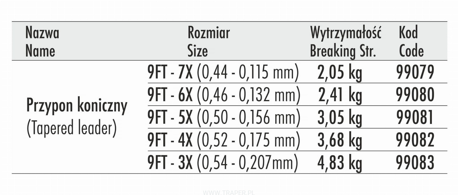 Japońskie, monolityczne przypony koniczne. Bardzo elastyczne, odporne na przetarcia, o podwyższonych parametrach wytrzymałości liniowej oraz na węzłach. Dwie sztuki w opakowaniu.