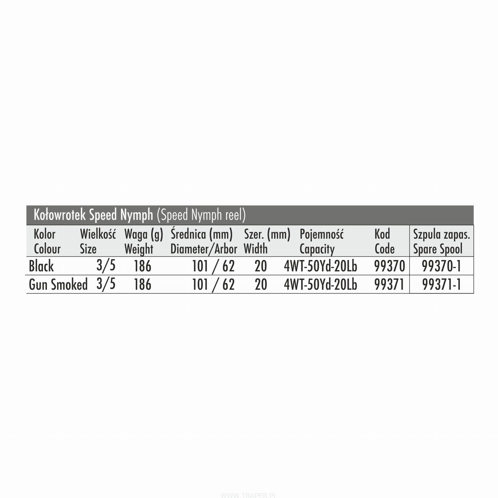 Kołowrotek wykonany z ciśnieniowo odlewanego aluminium w połączeniu z CNC. Duża średnica kołowrotka z wąską szpulą i dużym arborem, pozwala szybciej zwijać linkę, co przyspiesza łowienie. Konstrukcja korpusu z pełnym rantem zapobiega dostaniu się cienkiej linki pod szpulę. Bardzo dokładny, płynny hamulec umożliwia stosowanie cienkich przyponów bez obawy straty ryb. Wygodne, ergonomiczne pokrętło hamulca usprawnia i ułatwia kontrolę nad ucieczkami ryb. Kołowrotek Speed Nymph polecamy do dłuższych wędek 10'6” i 11'0” w klasie od 3 do 5.